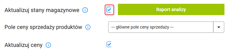 6. Wróć do ustawień i zaznacz checkbox Aktualizuj stany magazynowe.