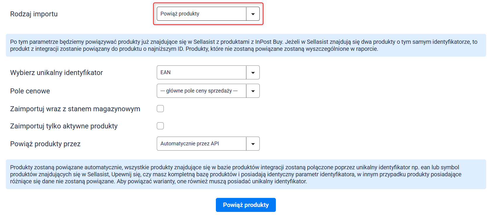 - Wybierz unikalny identyfikator: Parametr, po którym system będzie powiązywał produkty istniejące w Sellasist z produktami w InPost Buy. Jeśli w Sellasist znajdzie się kilka pozycji z tym samym identyfikatorem, integracja zostanie przypisana do produktu o najniższym ID. Produkty, których nie uda się powiązać, zostaną wskazane w raporcie.