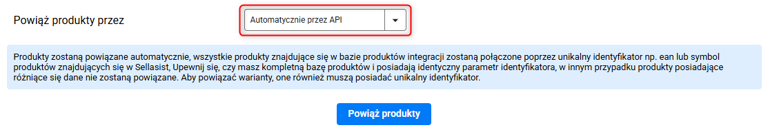 Automatycznie przez API: Produkty są łączone na podstawie unikalnego identyfikatora, np. EAN. Metoda ta sprawdza się, gdy bazy w obu systemach są w pełni zsynchronizowane i korzystają z identycznych oznaczeń. Jeśli dane produktów się różnią, system nie utworzy powiązania.