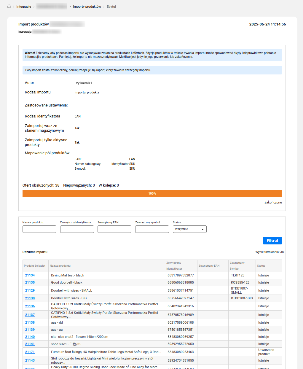 - Przygotowanie do importu: Na tym etapie system zbiera informacje wyłącznie o identyfikatorach produktów przeznaczonych do importu. Dane nie są jeszcze zapisywane w Sellasist, a produkty otrzymują status Przygotowany do importu i posiadają tylko nazwę oraz zewnętrzny identyfikator.