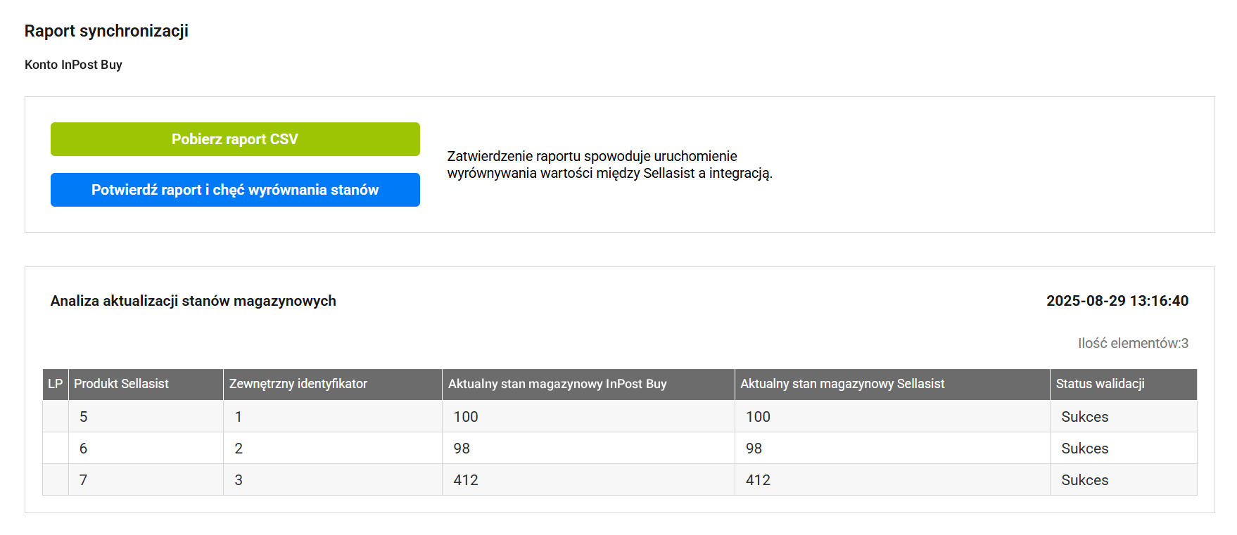 Przed uruchomieniem synchronizacji system porówna produkty między Sellasist a InPost Buy. Na tej podstawie powstanie raport wskazujący wszystkie różnice w właściwościach produktów. Po akceptacji raportu system zaktualizuje dane produktów w InPost Buy na podstawie danych z Sellasist, a synchronizacja zostanie włączona.