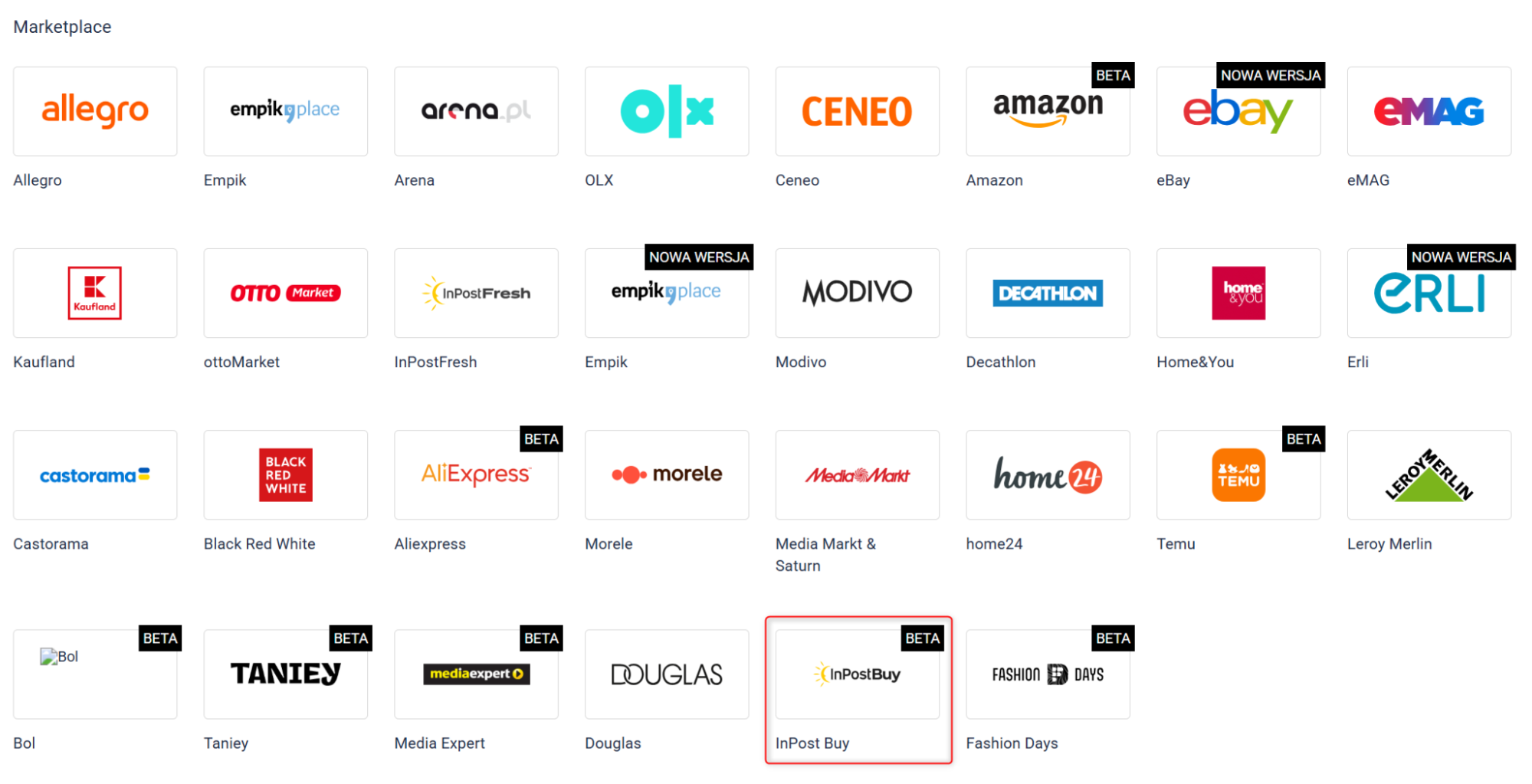1. Przejdź do Integracje → Dodaj nową integrację i w sekcji Marketplace wybierz InPost Buy.