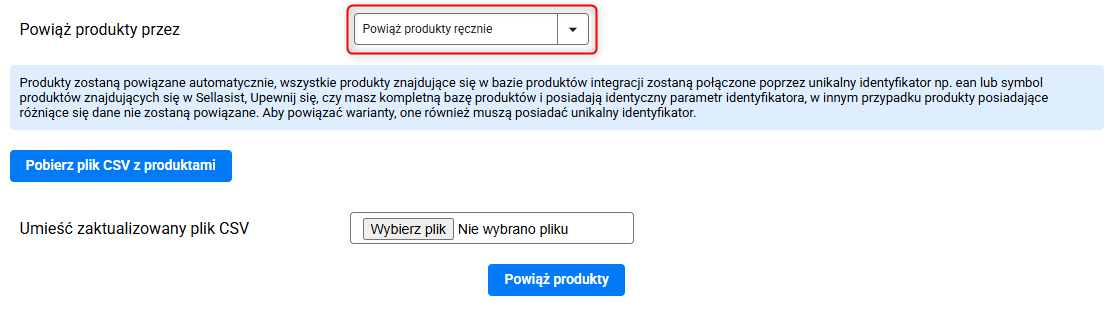 Powiąż produkty ręcznie: Precyzyjne dopasowywanie produktów mogących różnić się identyfikatorami w obu systemach poprzez pobranie pliku z pełnym katalogiem produktów z Sellasist, ręczne wskazanie w dokumencie pozycji do powiązywania i ponowne wgranie zaktualizowanego pliku do systemu.