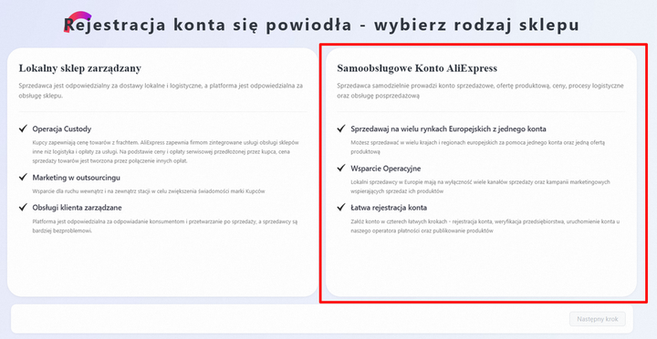 Zanim zaczniesz: Aby móc wystawiać oferty na AliExpress, podczas rejestracji konta wybierz opcję Samoobsługowe Konto AliExpress.