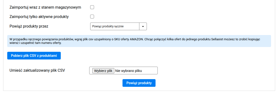 Aktualizuj statusy zamówień – Zaznacz, jeśli chcesz, aby statusy zamówień były aktualizowane w Sellasist zgodnie z danymi z Amazon. Ważne jest, aby statusy były odpowiednio zmapowane w zakładce Mapowanie statusów, inaczej aktualizacje nie będą przeprowadzane.