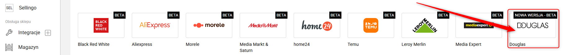 1. W panelu administracyjnym Sellasist przejdź do zakładki Integracje + ⇨ Douglas.