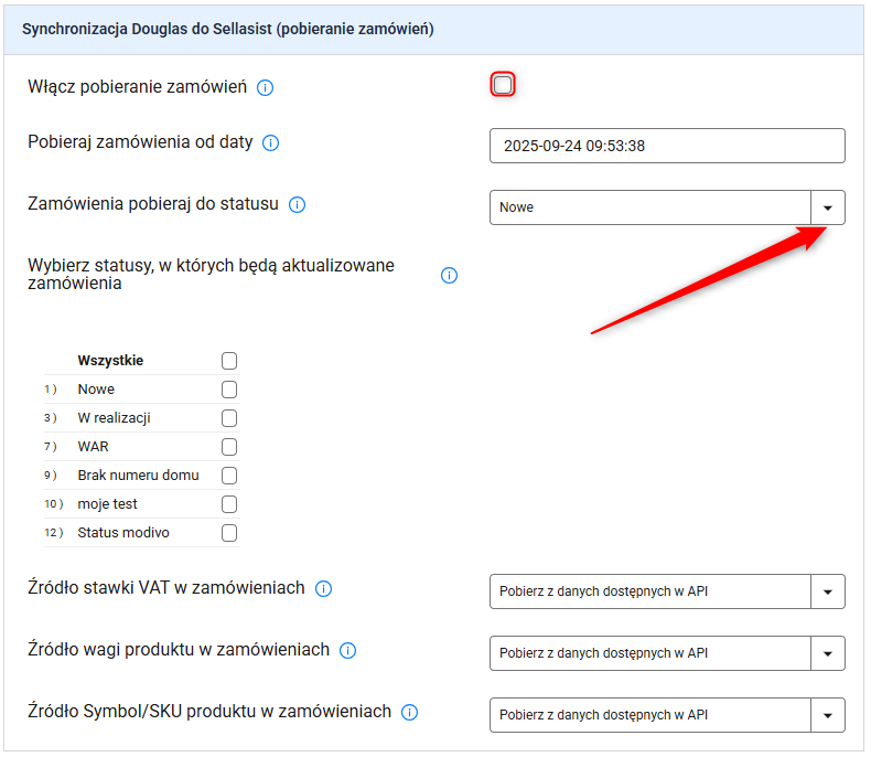Aktualizuj statusy zamówień – zaznacz, jeśli chcesz, aby statusy zamówień były aktualizowane w Sellasist zgodnie z danymi z Douglas. Ważne jest, aby statusy były odpowiednio zmapowane w zakładce Mapowanie statusów, inaczej aktualizacje nie będą przeprowadzane.
