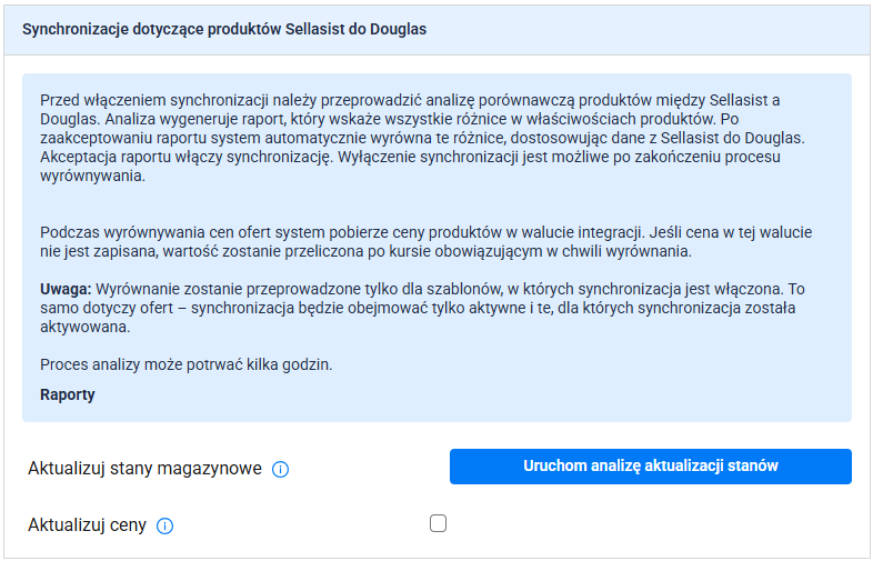 Raporty synchronizacji stanów magazynowych i cen są dostępne w ostatniej zakładce konfiguracji przy koncie Douglas w Sellasist.