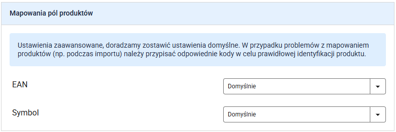 - Mechanizm obsługuje przypadek, w którym w ofertach zamienione są oznaczenia produktu. Przykładowo kod EAN jest zamieniony z Symbolem/SKU. Wartość „Domyślnie” oznacza zgodnie z dokumentacją integracji. Zmiana spowoduje przypisanie do oznaczenia, jego odpowiednik z listy wyboru.