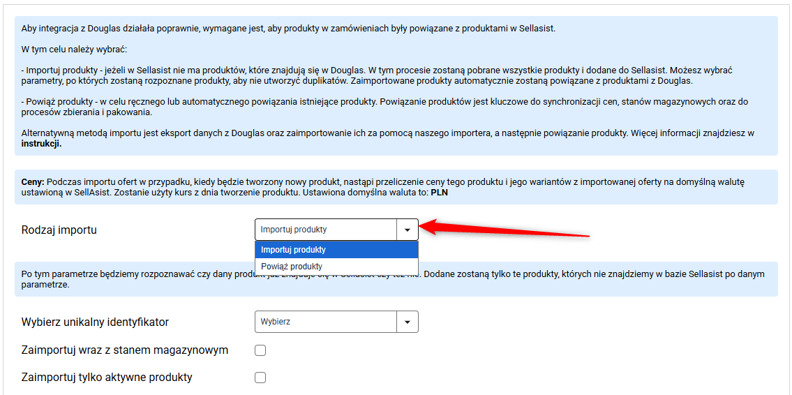 - Import produktów – wybierz, jeśli system ma tworzyć nowe produkty dla tych, które nie zostaną znalezione. Jeżeli w Sellasist brakuje produktów, które są dostępne w Douglas, możesz zdecydować się na import wszystkich brakujących produktów. Podczas tego procesu, produkty są automatycznie dodawane do Sellasist. Istotne jest określenie, po jakim parametrze system ma identyfikować produkty, aby uniknąć tworzenia duplikatów.