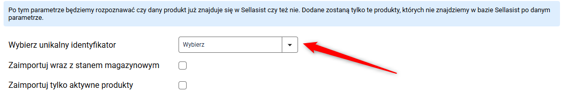 Wybierz unikalny identyfikator, na podstawie którego system będzie rozpoznawał, czy produkt już istnieje w Sellasist. Możesz wybrać EAN, Symbol lub Numer Katalogowy, w zależności od wcześniejszej konfiguracji w sekcji „Mapowanie pól produktów”.