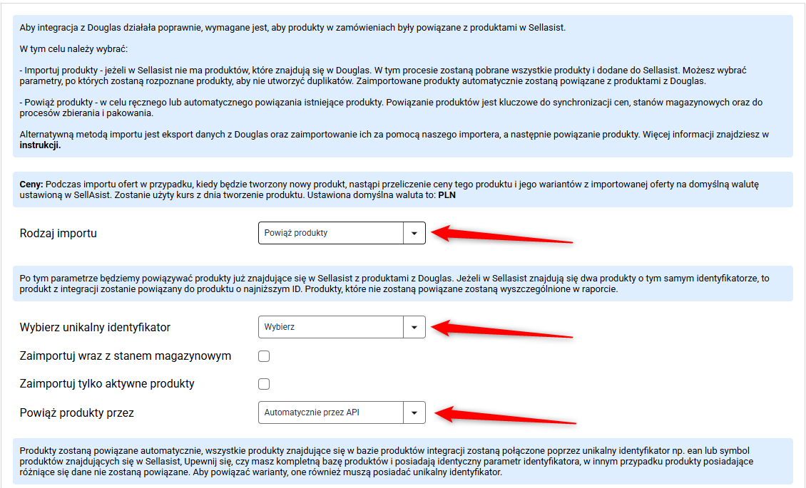 Ta opcja pozwala na automatyczne lub ręczne powiązanie produktów już istniejących w Sellasist z odpowiadającymi im produktami w Douglas. Kluczowym elementem jest tutaj wybór odpowiedniego unikalnego identyfikatora, który może być EAN, numerem katalogowym lub symbolem produktu.