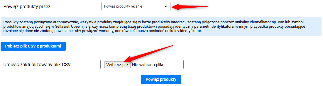 - Powiąż produkty ręcznie – Możesz pobrać i edytować plik z całą bazą produktów, wskazując produkty do powiązania, a następnie załadować zaktualizowany plik.