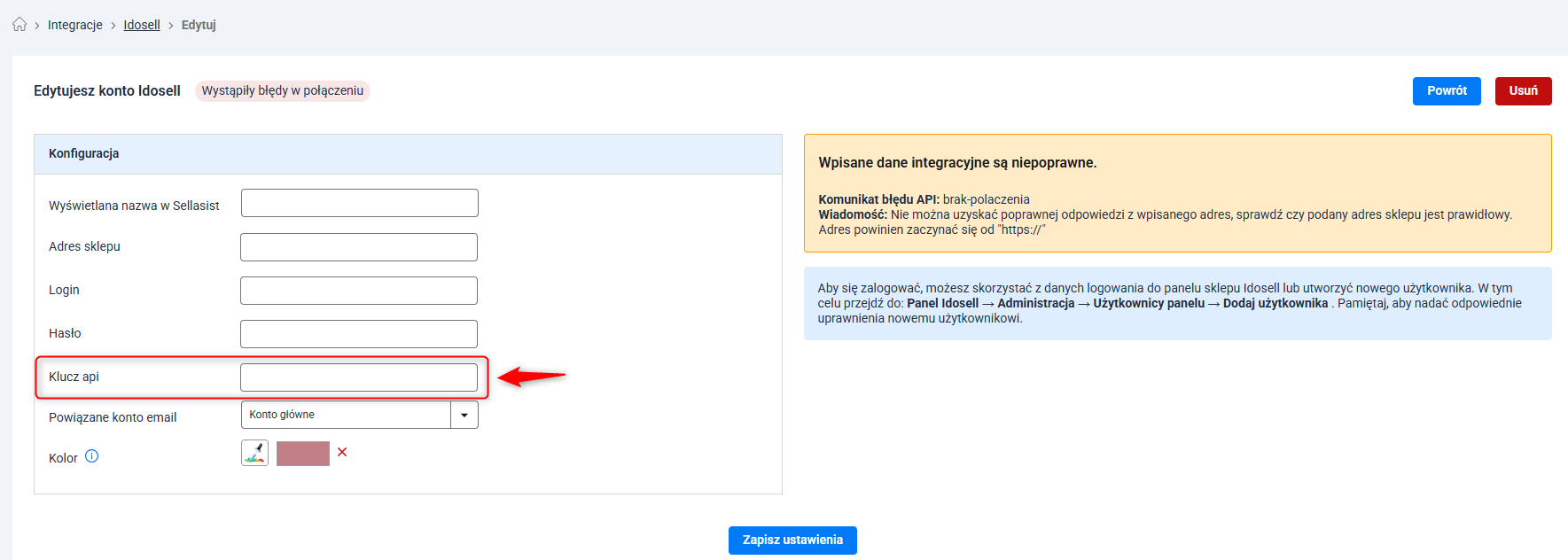Od 1 stycznia integracja z IdoSell będzie wymagała uzupełnienia nowego pola "Klucz API" w konfiguracji połączenia.