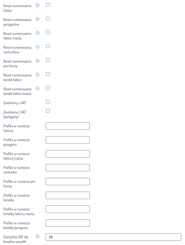 - Prefiksy dla dokumentów sprzedaży: Własny przedrostek dla numeru pomagający łatwo zidentyfikować dokument, np. "FV".