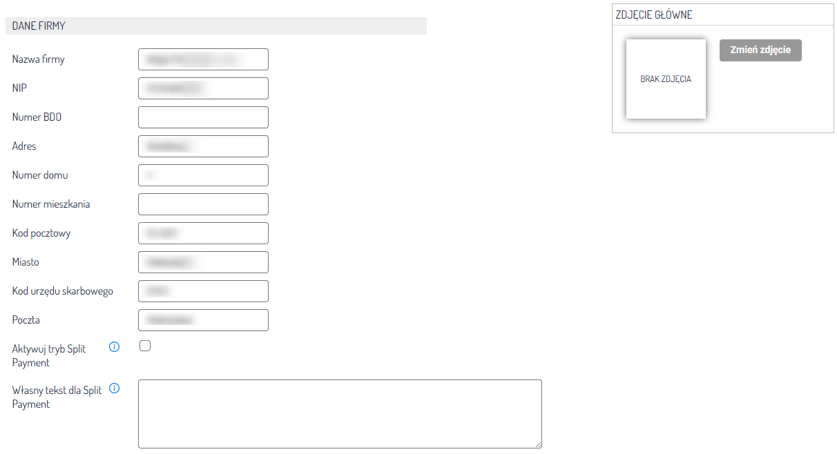 - Uzupełnij podstawowe dane firmowe według opisu poszczególnych pól i dodaj zdjęcie główne, które będzie używane jako logotyp firmy na fakturach.