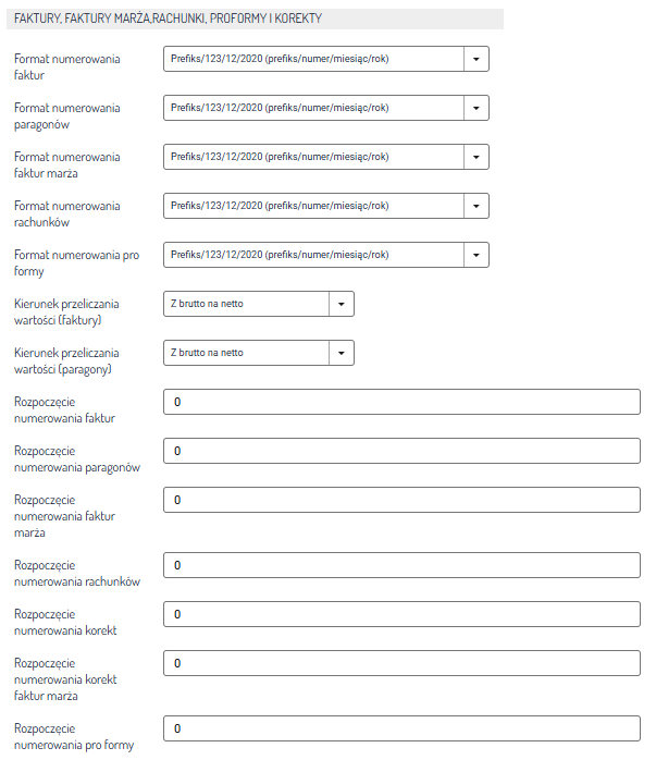 - Rozpoczęcie numerowania dokumentów sprzedaży: Liczba, od jakiego ma się zacząć numeracja.