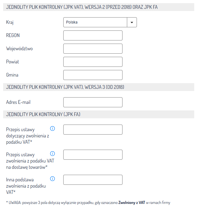 W razie potrzeby tutaj możesz uzupełnić dane dla plików JPK.