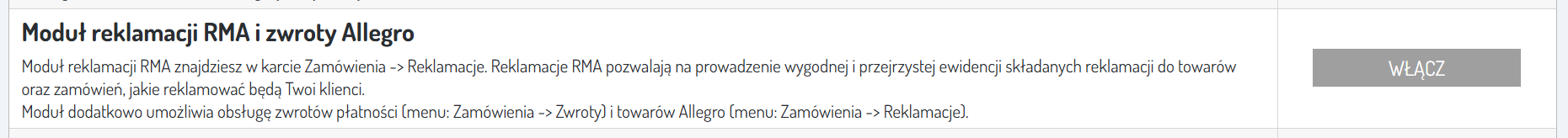 Administracja → Funkcje eksperymentalne → Moduł reklamacji RMA i zwroty Allegro. Więcej na temat funkcji eksperymentalnych znajdziesz
