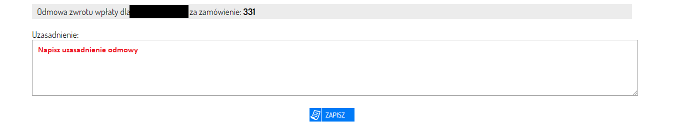 Jeśli z jakiegoś powodu musisz odmówić przyjęcia zwrotu, na karcie konkretnej reklamacji kliknij przycisk Odmowa zwrotu. Na ekranie zobaczysz okno tekstowe. Wpisz uzasadnienie swojej decyzji i kliknij przycisk Zapisz.