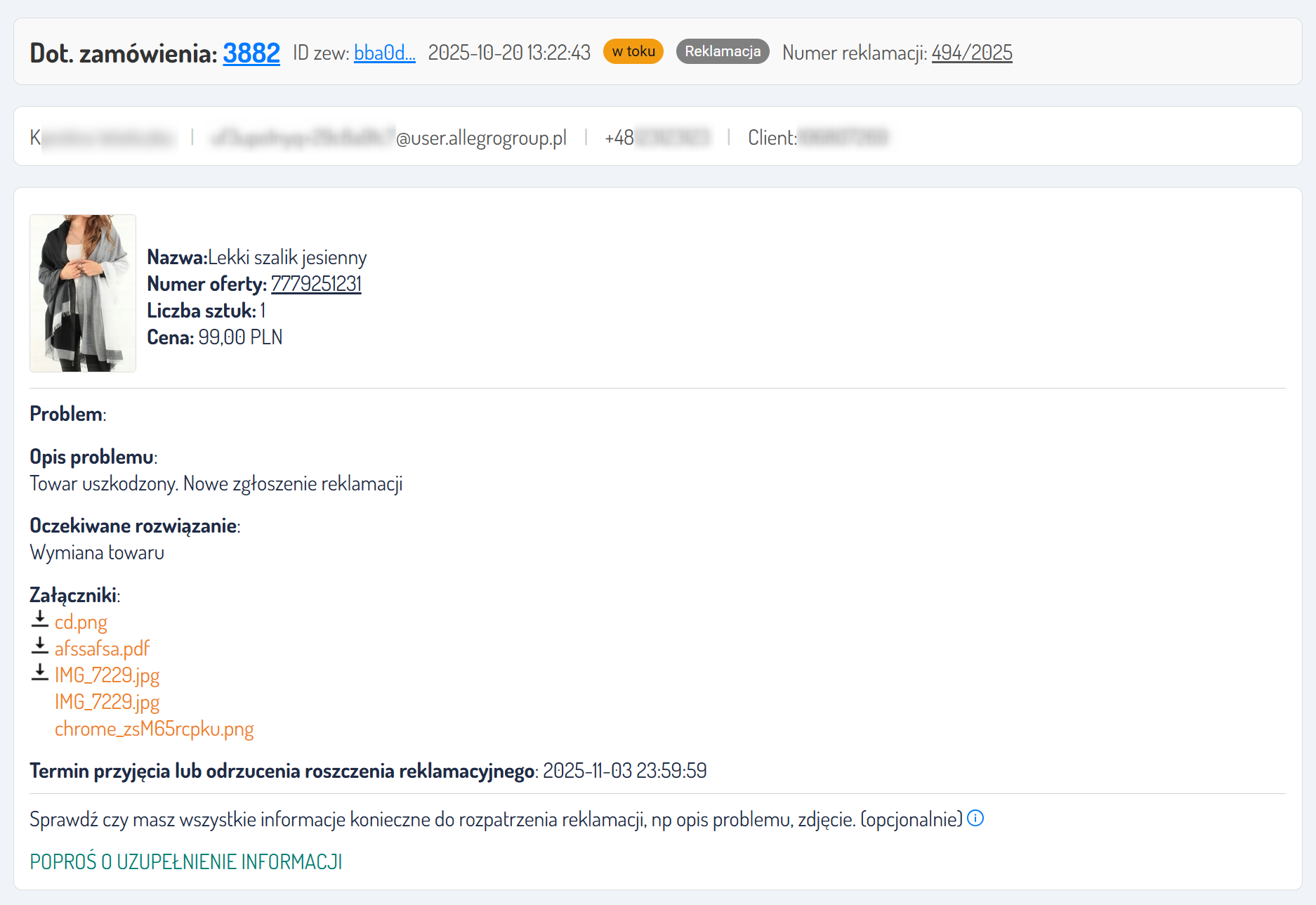 Na karcie zgłoszenia reklamacyjnego znajdziesz wszystkie kluczowe informacje na temat zamówienia, w tym: