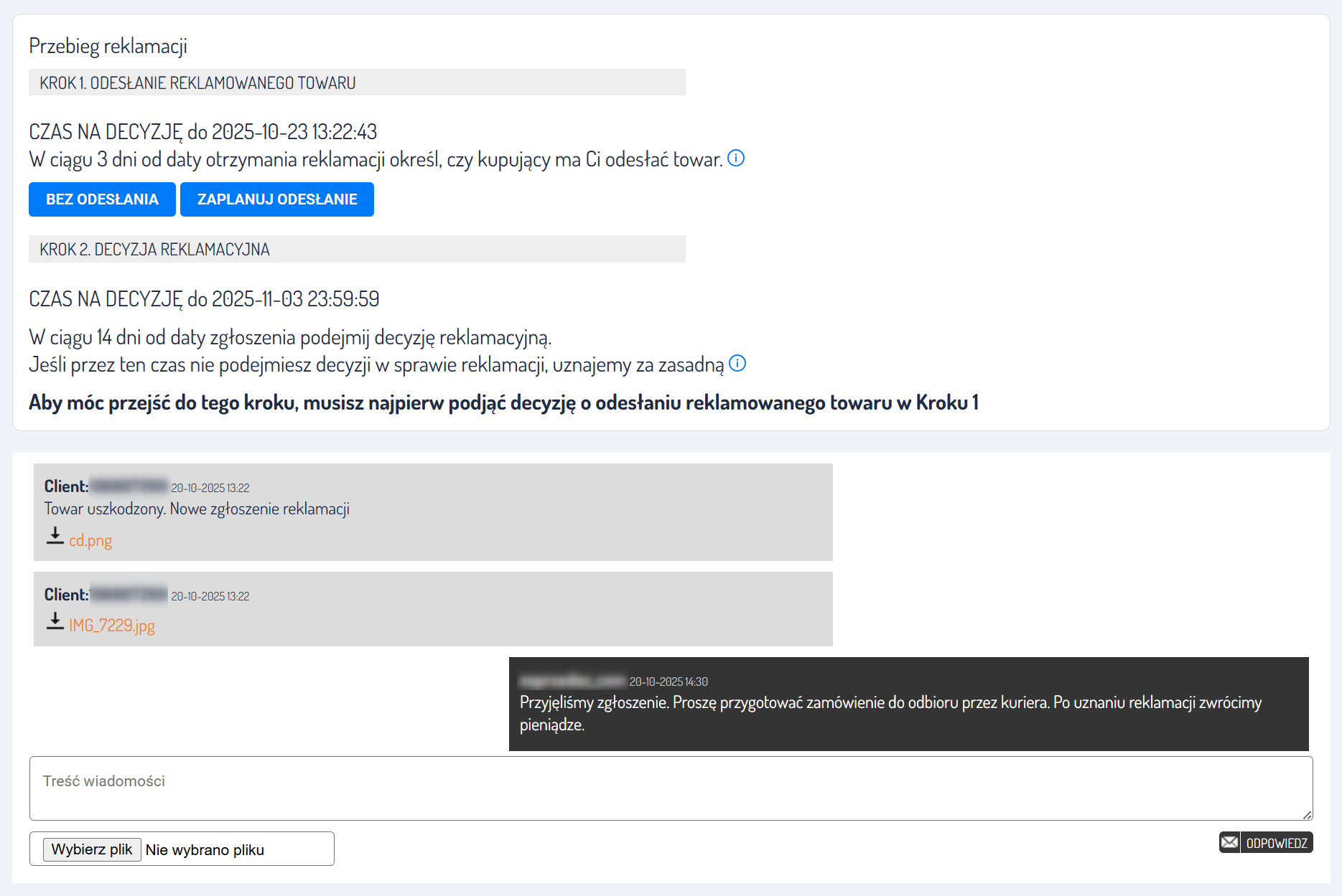 Na karcie zgłoszenia możesz także wykonywać wszystkie działania związane z obsługą reklamacji — takie jak prośba o uzupełnienie informacji, decyzja o odesłaniu reklamowanego towaru czy zaakceptowaniu reklamacji, a także bezpośredni kontakt z kupującym.