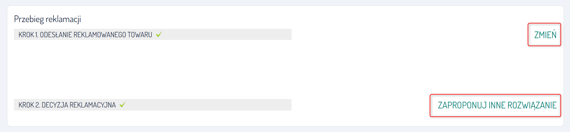Wskazówka: Po zaakceptowaniu (lub odrzuceniu) zgłoszenia, możesz zmienić swoją decyzję, klikając przyciski Zmień albo Zaproponuj inne rozwiązanie (screen poniżej).
