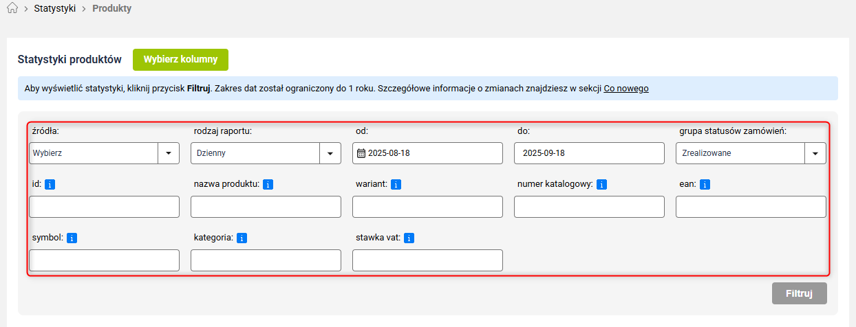 Pozostałe filtry: Dodatkowe filtry pozwolą Ci np. wyszukać statystyki produktu po nazwie. Możesz dowolnie łączyć filtry by uzyskać jak najlepsze dane, jak nazwę produktu i stawkę VAT.