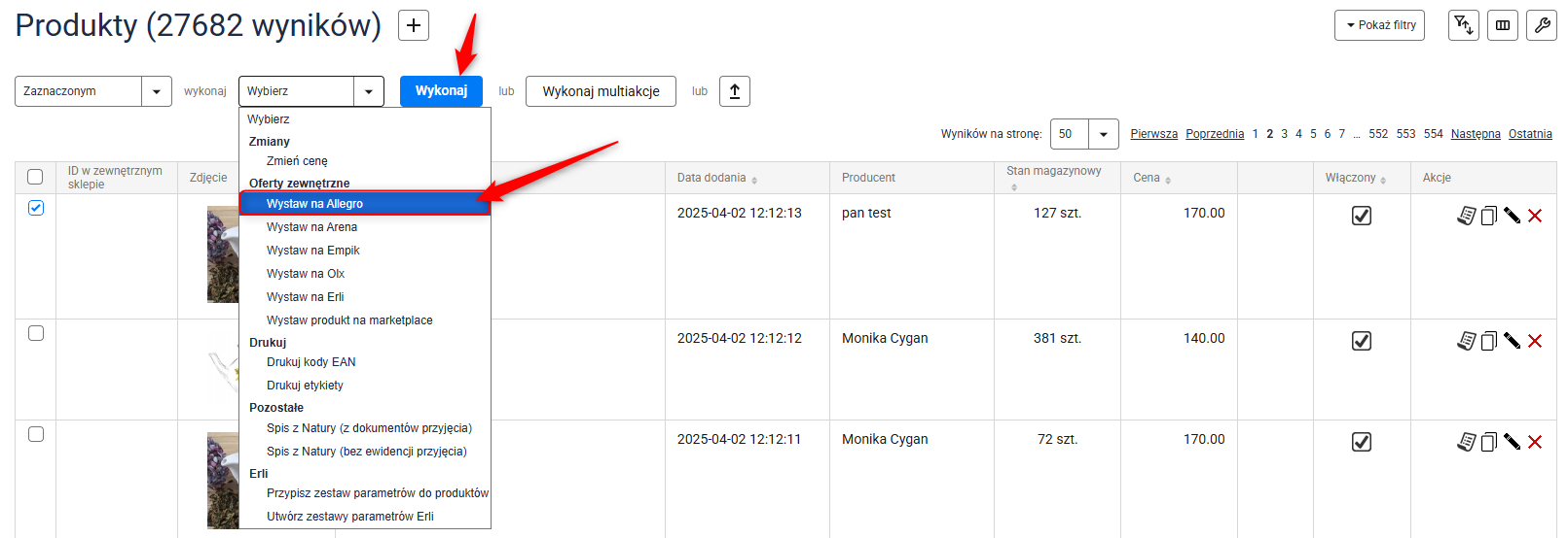 4. Z rozwijanej listy wybierz Wystaw na Allegro.
