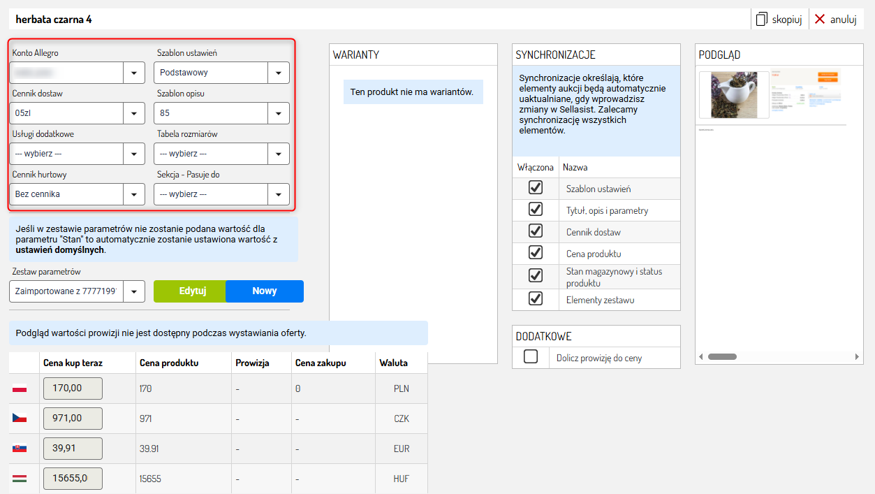 W widoku edycji oferty masz możliwość zapoznania się z ze wszystkimi informacjami dotyczącymi ceny produktu, prowizji czy waluty.