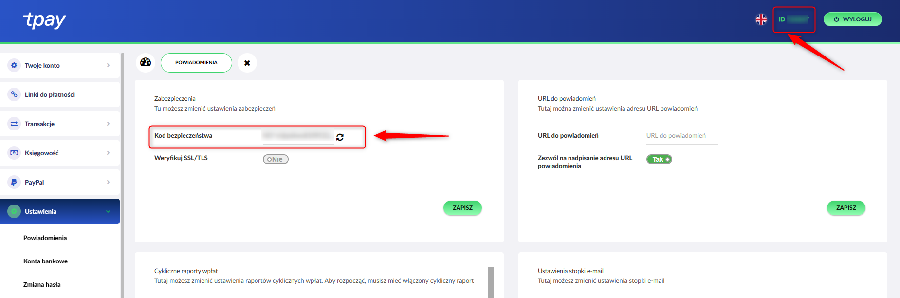 - ID sprzedawcy: Twój indywidualny numer sprzedawcy u operatora płatności. ID i kod bezpieczeństwa z reguły znajdziesz w panelu na koncie operatora płatności. W przypadku Tpay: Ustawienia → Powiadomienia (screen poniżej).