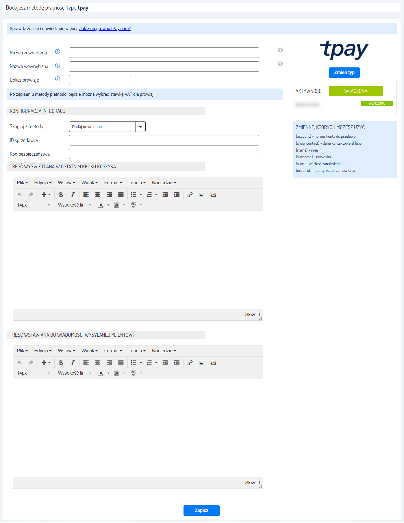 - Treść wyświetlana w ostatnim kroku koszyka: Informacja, która pojawi się po podsumowaniu zamówienia. Możesz dodać np. zapis: Wybrana metoda płatności: Tpay lub pozostawić puste pole.