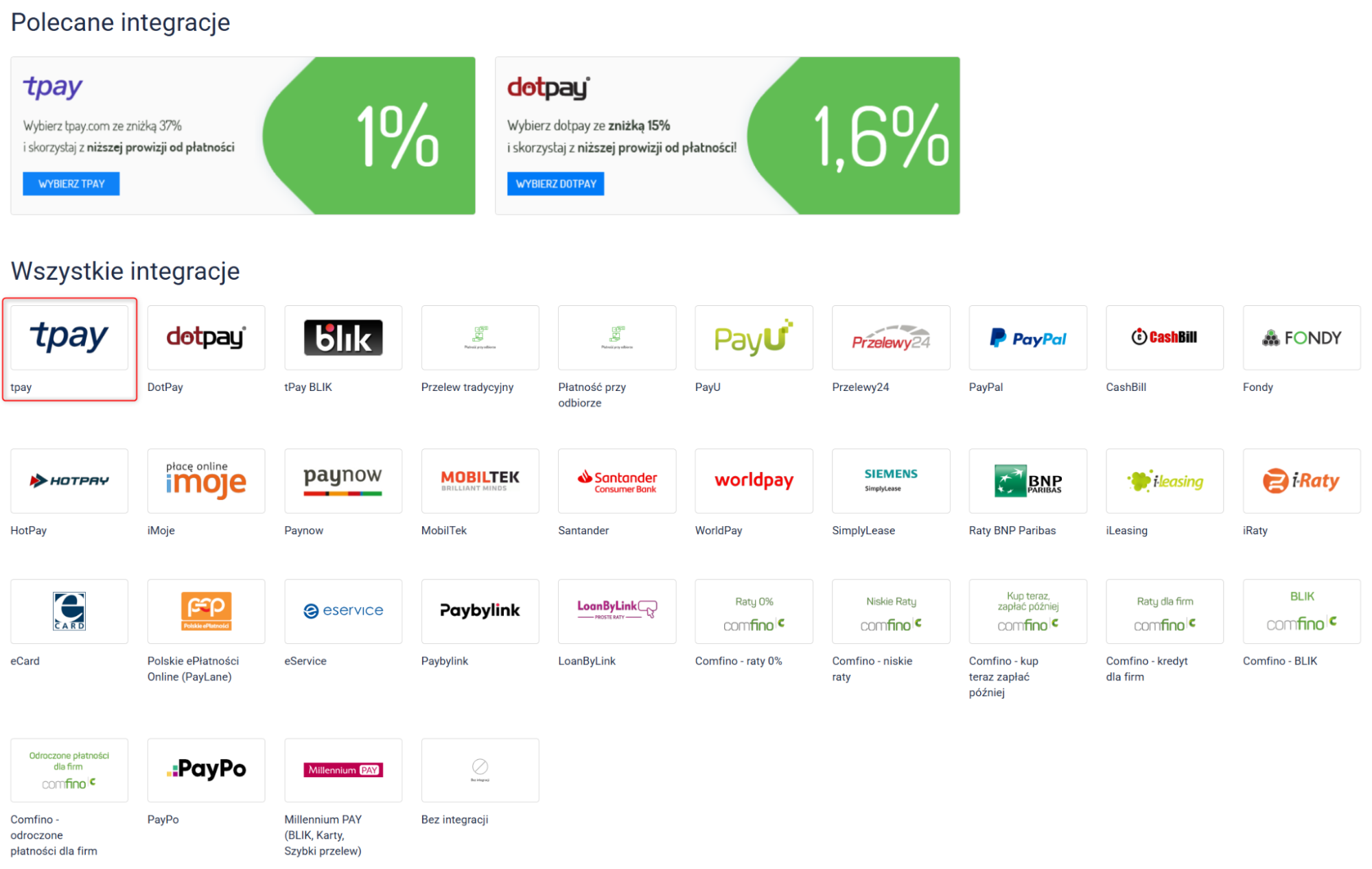 2. Na liście dostępnych metod płatności wybierz tę, którą chcesz zintegrować, np. Tpay.