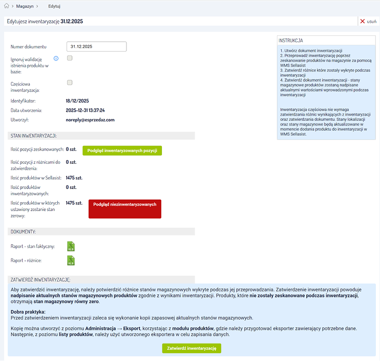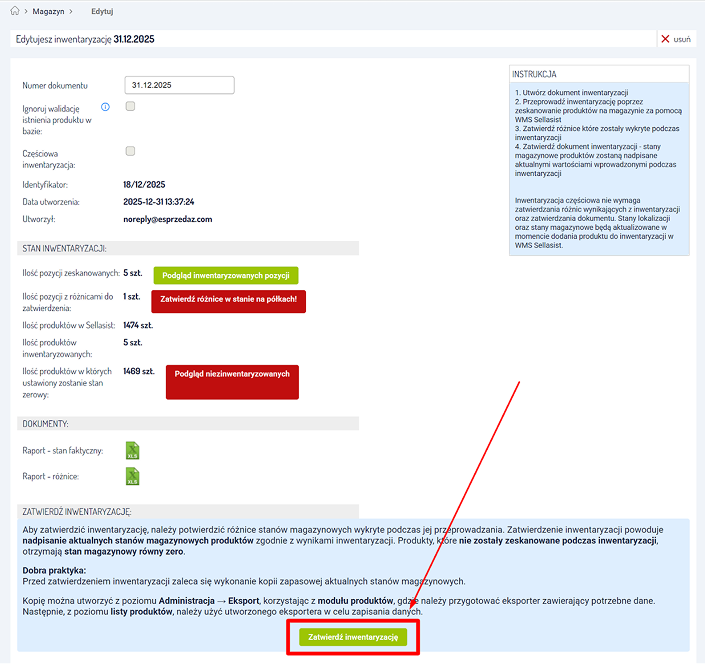 12. Po przeliczeniu wszystkich produktów na magazynie możemy zatwierdzić inwentaryzację. Wszystkie nie zeskanowane produkty będą miały stan zerowy.