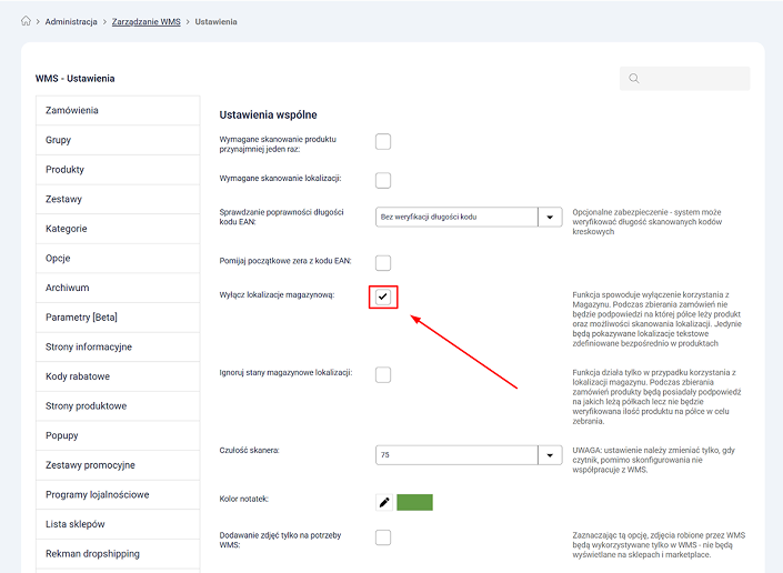 > zaznacz opcję Wyłącz lokalizację magazynową.