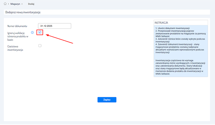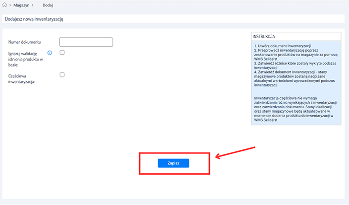 Następnie uzupełnij numer dokumentu i utwórz dokument inwentaryzacji, klikając Zapisz.