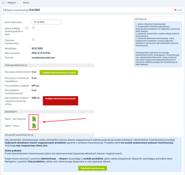 16. Po dokonaniu inwentaryzacji z Sellasist WMS w prosty sposób wydrukujesz raport, który znajdziesz w Magazyn ⇨ Inwentaryzacja. Możesz pobrać dokumenty: Raport - stan faktyczny, Raport - różnice. Raporty te są niezbędne do rozliczeń księgowych.