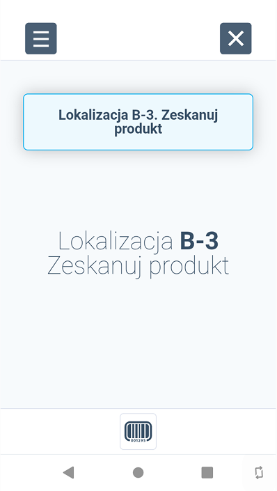 6. Aplikacja po zeskanowaniu kodu kreskowego lokalizacji sprawnie przeprowadzi Cię przez kolejne czynności. W naszym przykładzie zeskanowaliśmy lokalizację B-3.