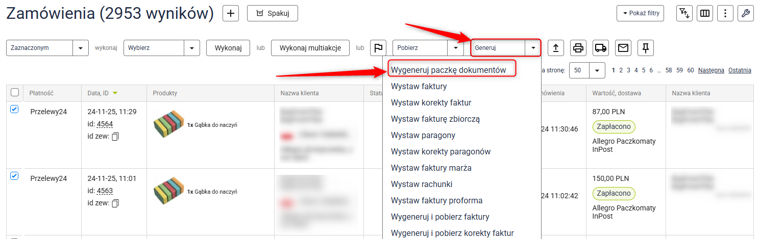 3. Zaznacz zamówienia, dla których chcesz wygenerować dokumenty.