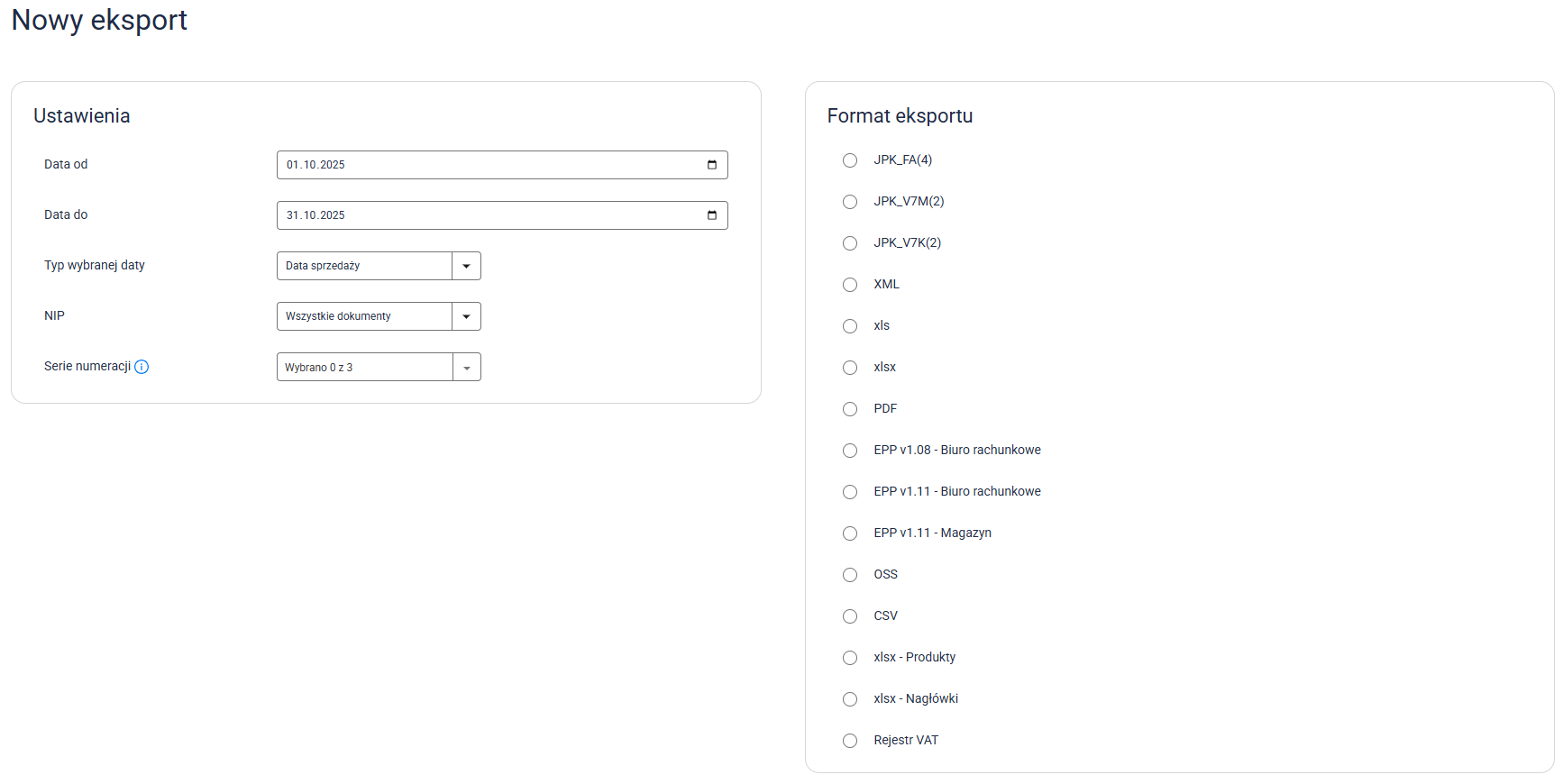 4. Wybierz eksport dokumentów sprzedażowych lub magazynowych i skonfiguruj opcje eksportu.