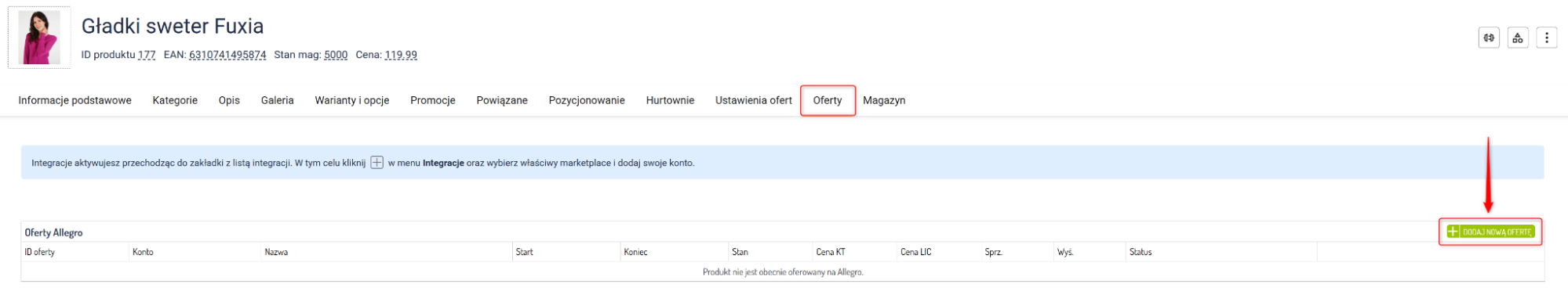 2. Przejdź do zakładki Oferty i w oknie Oferty Allegro kliknij przycisk Dodaj nową ofertę.
