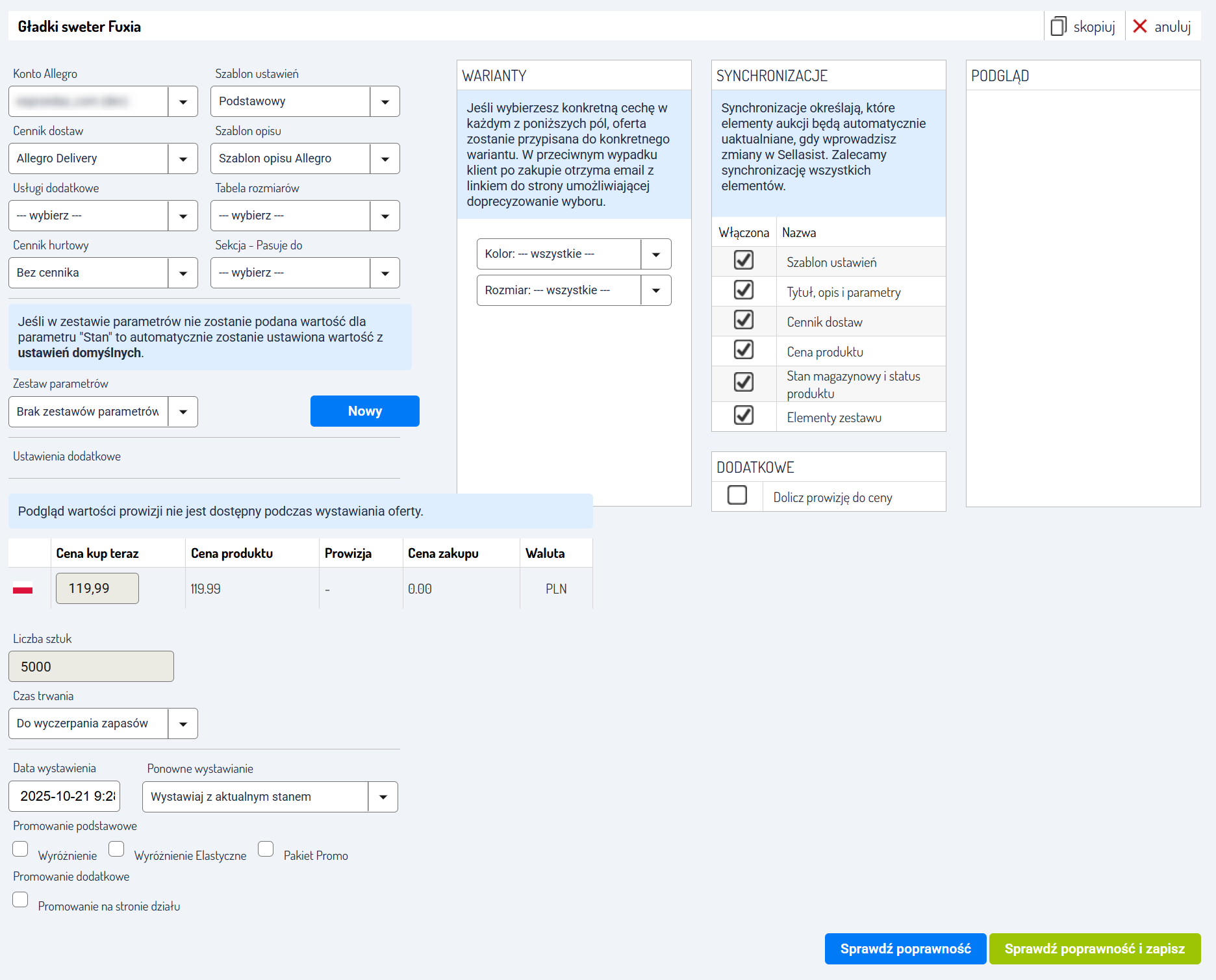 Wybierz konto Allegro, na którym chcesz wystawić ofertę i wypełnij pozostałe ustawienia oferty.
