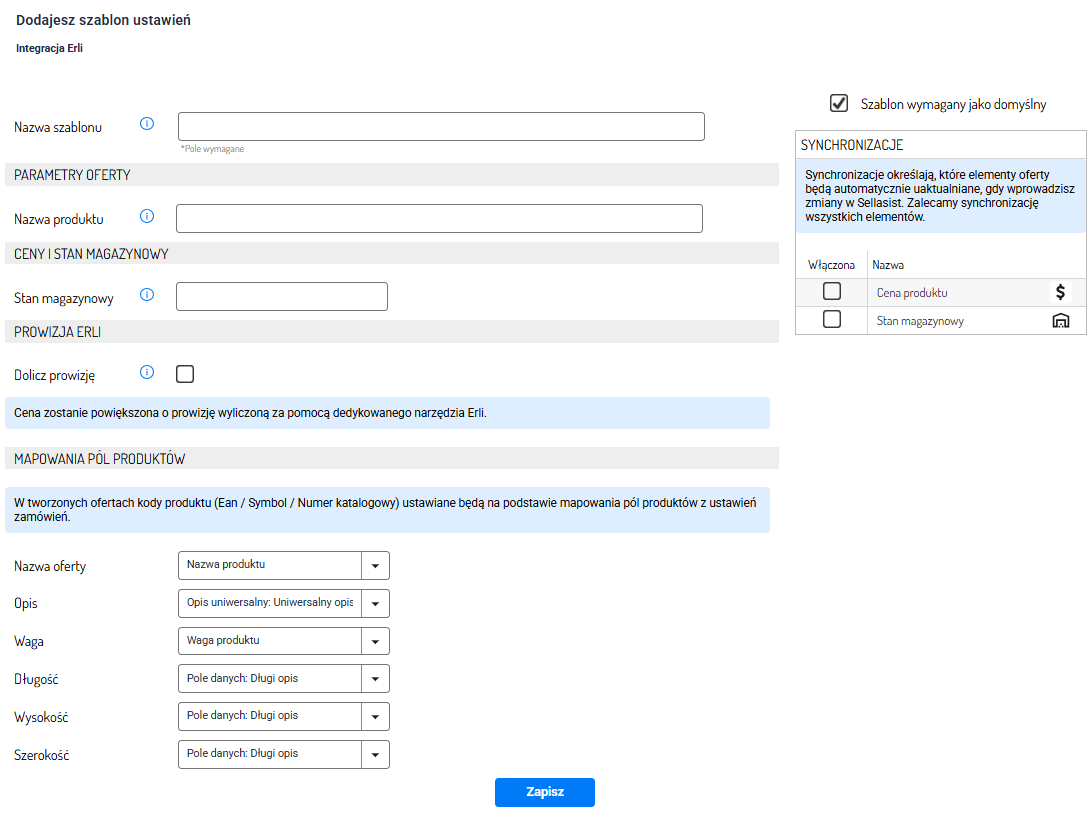 2. Na ekranie zobaczysz okno wyboru szablonu ustawień. Z rozwijanej listy wybierz Twój szablon Erli i kliknij przycisk Zapisz.