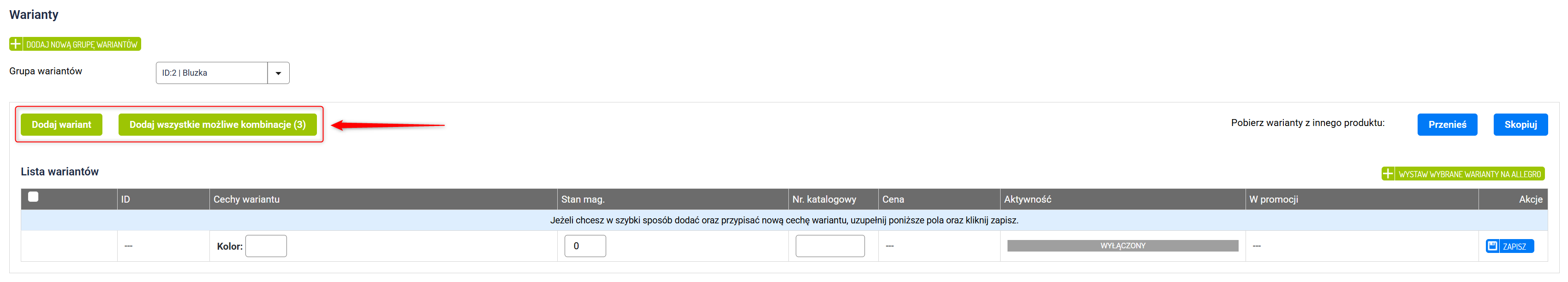 2. Dodaj pojedynczy wariant lub wszystkie możliwe kombinacje dla danego produktu.
