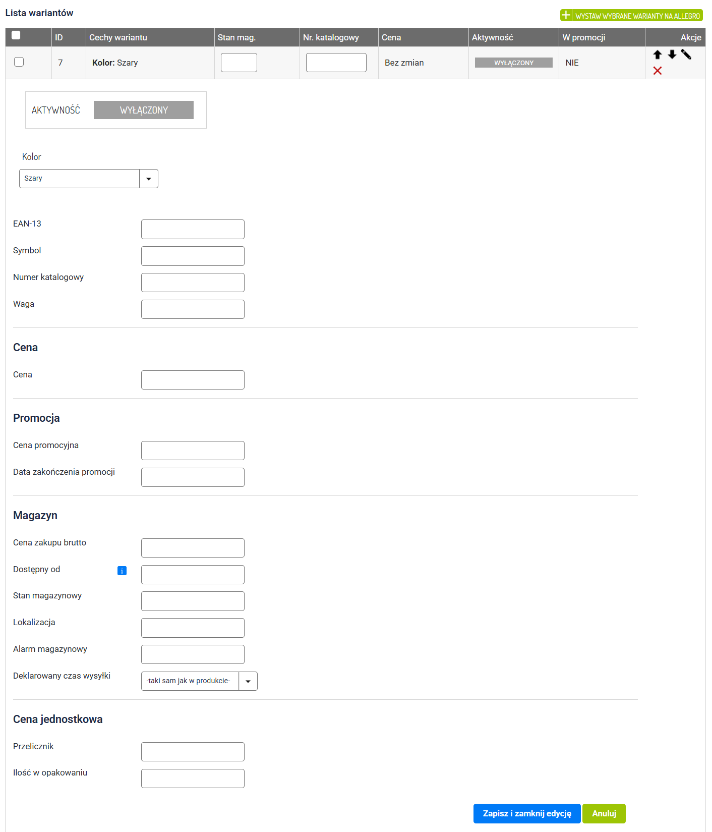 3. Po dodaniu wariantu, na ekranie zobaczysz formularz jego edycji. Wypełnij wszystkie wymagane pola zgodnie z informacjami na temat Twojego produktu i kliknij przycisk Zapisz i zamknij edycję. Proces powtórz dla każdego dodanego wariantu.