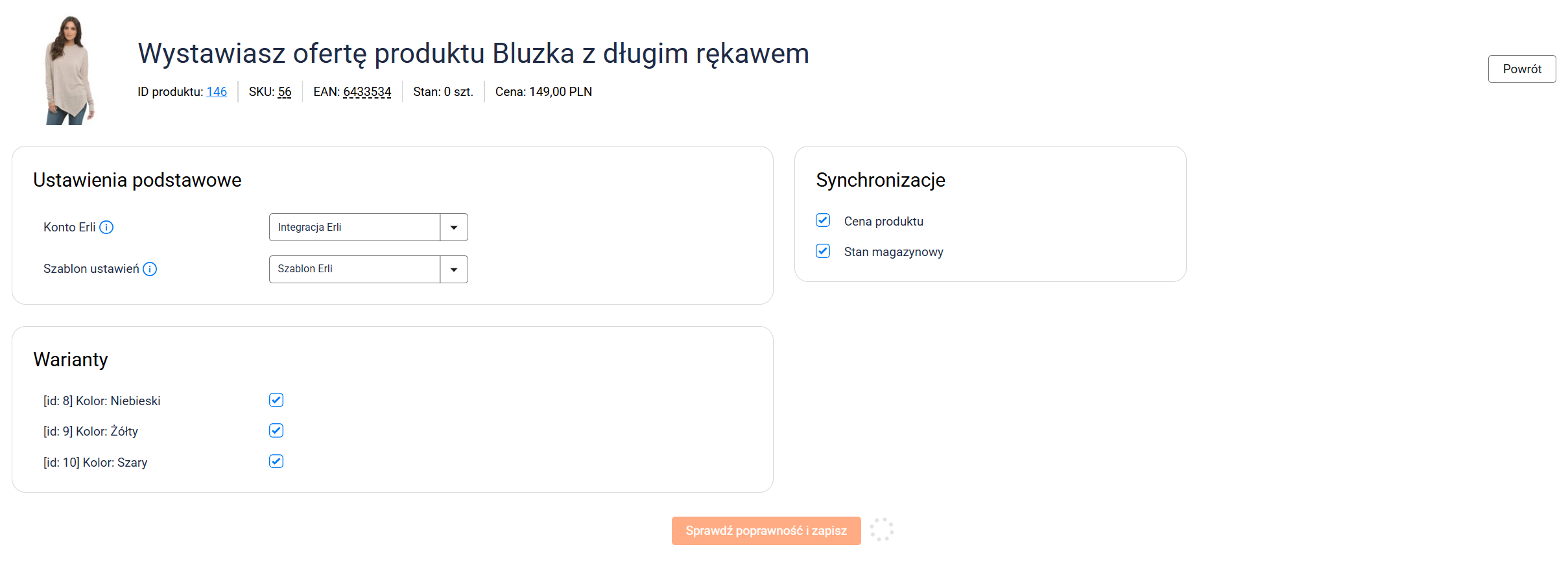 7. Na ekranie zobaczysz formularz wystawiania oferty. W sekcji Ustawienia podstawowe wybierz konto i szablon, które chcesz przypisać do tej oferty, a w sekcji Synchronizacje zdecyduj, czy chcesz synchronizować ceny i stan magazynowy produktu w ofercie. Następnie kliknij przycisk Sprawdź poprawność i zapisz.