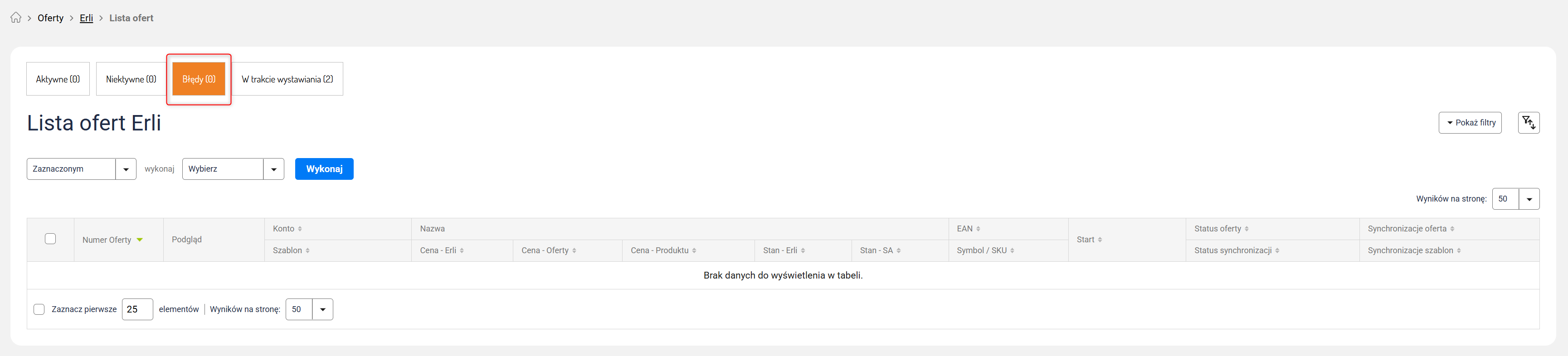 4. Jeśli z jakiegoś powodu oferta nie zostanie wystawiona, szczegóły zdarzenia znajdziesz w zakładce Błędy. Po wprowadzeniu wymaganych zmian, możesz ponowić wystawianie każdej takiej oferty.