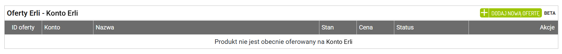 6. Przejdź do zakładki Oferty, znajdź na liście pozycję Oferty Erli i kliknij przycisk Dodaj ofertę.