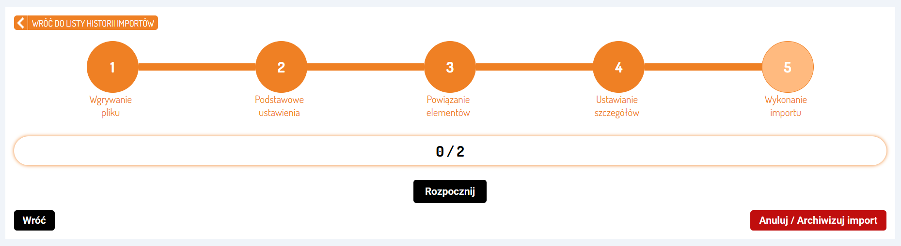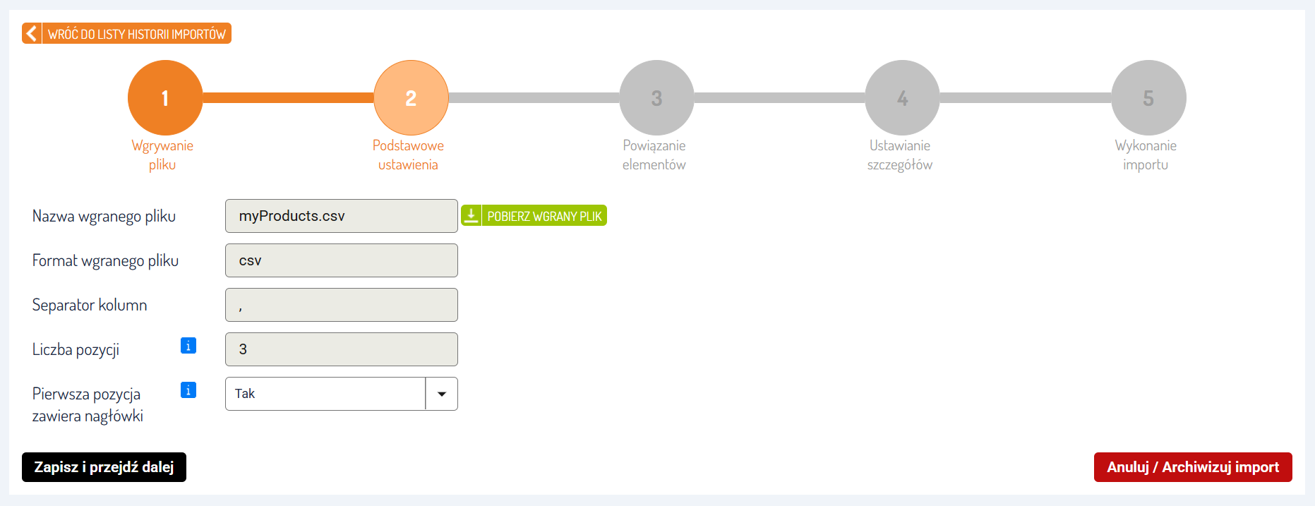Sprawdź podsumowanie wgranego pliku i wprowadź podstawowe ustawienia importu.