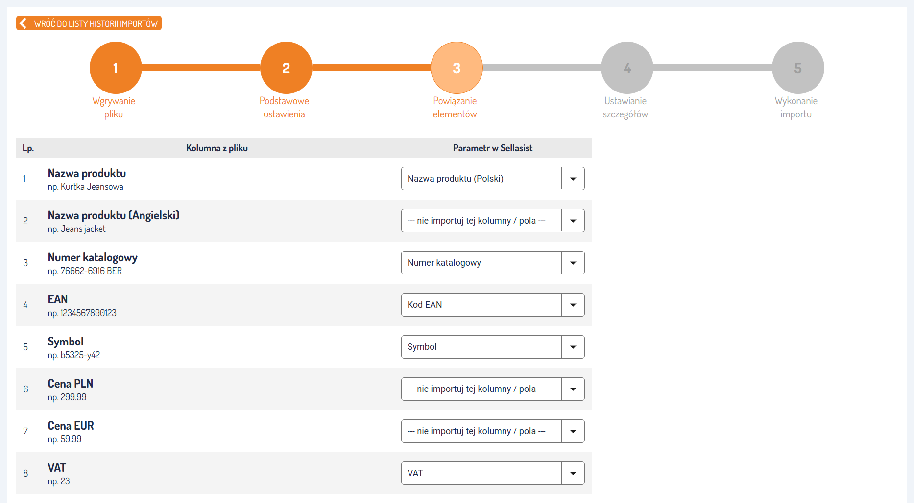 - Prawa strona: Rozwijane listy z polami Sellasist. Wybierz, do którego pola mają trafić dane z poszczególnych kolumn.